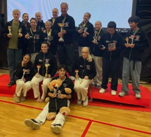 I kumite i Heian deler de inn i høy og lav for alle u.14 klasser i kumite. En rekke av våre katautøverne går også kumite, og Mildrid, som hadde 2 gull fra lagkata og sølv fra individuelt kata, la til nok et gull i kumite jenter 12 år lav , og ble dermed stevnets beste jente. Videre ble det sølv til Marius Sveen Vossli i gutter 11 år lav, bronse til Sophia i jenter 12 år høy, hvor dessverre Sophia ble bortdømt i semifinalen, med skåringer imot som hun blokkerte. Vilmer A. Hesselberg tok bronse 12 år høy, mens i gutter 13 år høy ble det gull til Theodor og bronse til Yurie. I 14/15 år kumite – 70 kg, gikk Tobie Bye til finalen men ble bortdømt i siste sekund da han blokkert et spark til hodet fint, men en av dommerne så det som skåring, og da kastet en annen dommer seg på for å støtte, og helt feilaktig tapte Tobie. På damesiden hadde vi med 5 juniorer hvor Linnea S. Martby vant -53 kg, mens Madeleine Johannesen, fra Sportskarate Drammen stilte for oss denne gangen, også røk på feildømming i sin semifinale i -59kg, og gikk til bronsefinale og vant den. I -66 kg ble det bronser på Olivia Ness og Hedda Reinemo, mens Majra Trako var i det umulige hjørnet denne lørdagen og vant -66kg etter nærmest oppvisningskarate i flere kamper. Junior lag kumite damer stilte merkelig nok kun våre to lag, og i og med at en av de opprinnelige utøverne på laget trakk seg tidligere i uken ble det seier til laget med Majra, Linnea og Madeleine, foran Hedda og Olivia.