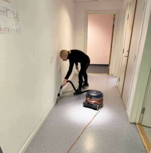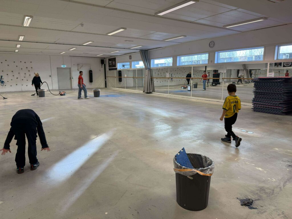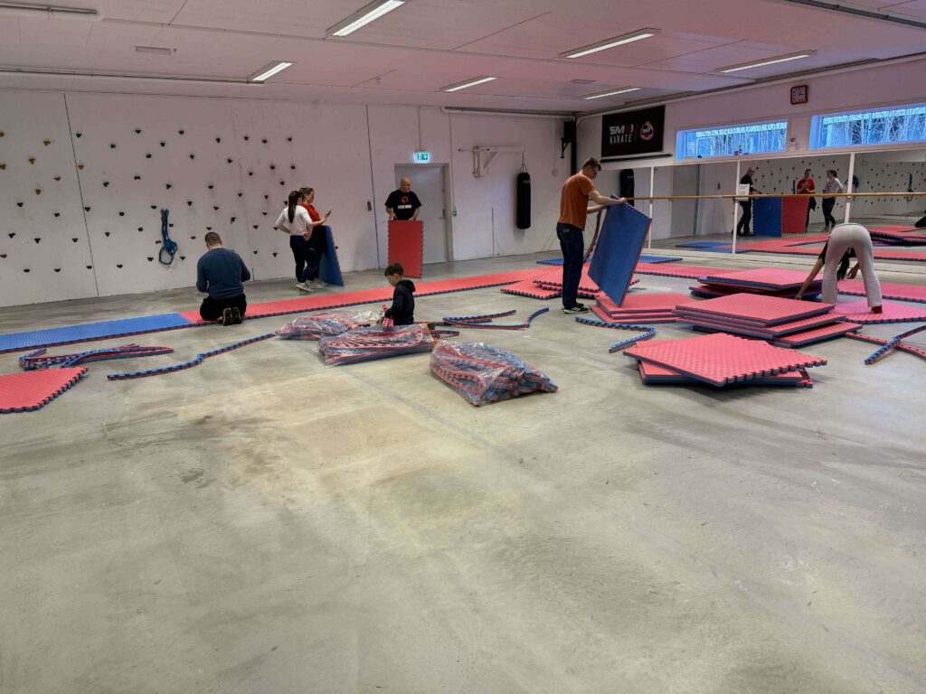 Konkurranseutøvere og ledere/dommer var ikke bare opptatt med stevne i helgen. Søndag ble alle de gamle mattene byttet ut med nye på dugnad. Fredag hadde Anthony, Lissy og Morten sørget for å få mattene i hus, lørdag var mange engasjert i Smai Mini Cup 5 som dere kan lese om et annet sted på denne siden, og søndag ble det arrangert dugnad. I tillegg til våre trenere og styremedlemmer deltok en rekke foreldre og utøvere. De gamle mattene ble fjernet, det ble støvsuget og vasket etter alle kunstens regler, og nye matter ble lagt. Det ble også byttet ut noen speil, så dojoen har fått en skikkelig make over. Vi skal ikke bare være blant de beste klubbene i Norge rent faglig, vi skal ha de beste fasilitetene også.