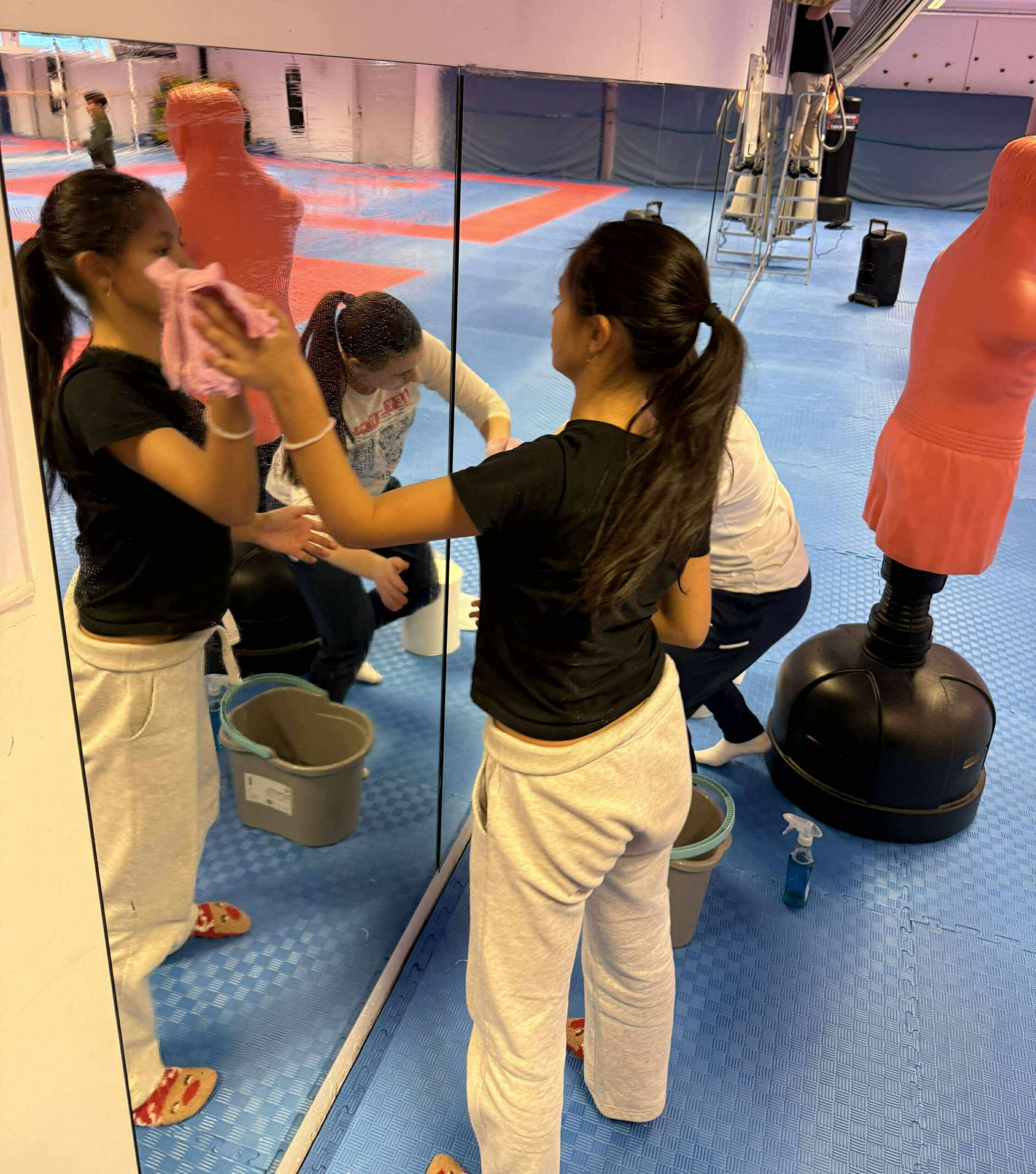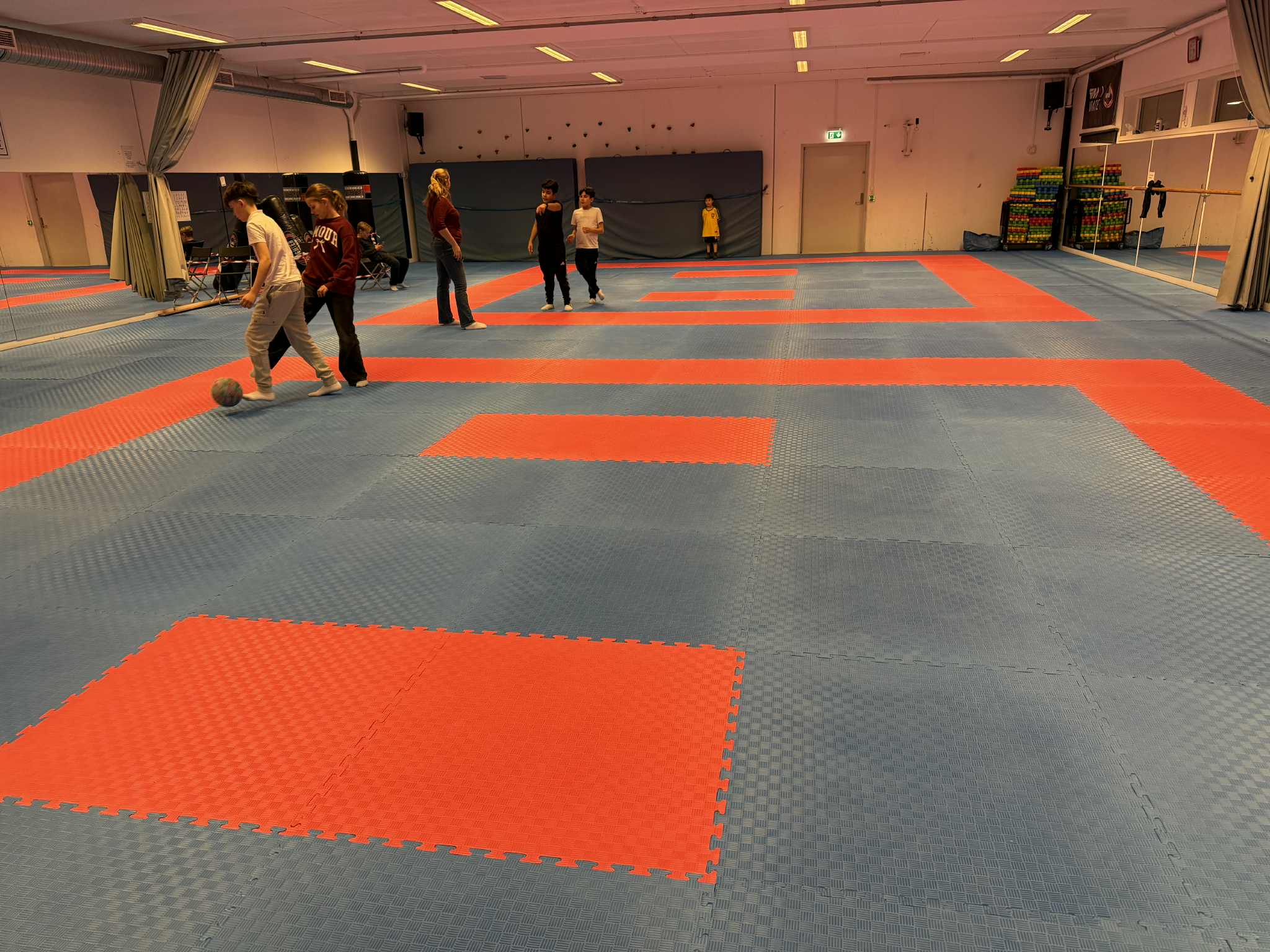Konkurranseutøvere og ledere/dommer var ikke bare opptatt med stevne i helgen. Søndag ble alle de gamle mattene byttet ut med nye på dugnad. Fredag hadde Anthony, Lissy og Morten sørget for å få mattene i hus, lørdag var mange engasjert i Smai Mini Cup 5 som dere kan lese om et annet sted på denne siden, og søndag ble det arrangert dugnad. I tillegg til våre trenere og styremedlemmer deltok en rekke foreldre og utøvere. De gamle mattene ble fjernet, det ble støvsuget og vasket etter alle kunstens regler, og nye matter ble lagt. Det ble også byttet ut noen speil, så dojoen har fått en skikkelig make over. Vi skal ikke bare være blant de beste klubbene i Norge rent faglig, vi skal ha de beste fasilitetene også.